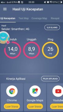 Dari hasil uji coba yang aku lakukan, hasilnya cukup bagus. Bahkan untuk performa kecepatan pada aplikasi yang sering aku gunakan pun juga luar biasa. Kita juga bisa melakukan pengujian di tempat berbeda ketika sedang dalam perjalan. Misalkan saja, saat saya berkunjung ke rumah teman suami yang berada di pelosok desa di Tuban. Hasil uji coba juga bagus hasilnya.